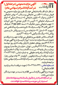 <table class="table table-bordered"> <tbody> <tr> <td><strong>موضوع</strong></td> <td dir="rtl"><strong>شرح</strong></td> </tr> <tr> <td> نام هلدینگ</td> <td>شرکت سرمایه گذاری آتیه صبا<br> </td> </tr> <tr> <td>نام شرکت درخواست دهنده<br> </td> <td>شرکت آپاداناسرام</td> </tr> <tr> <td> نوع فراخوان</td> <td>مزایده</td> </tr> <tr> <td> موضوع فراخوان</td> <td>آگهی مزایده فروش اقلام ضایعاتی شرکت آپاداناسرام</td> </tr> <tr> <td> روزنامه درج آگهی</td> <td> <span>روزنامه اطلاعات، صفحه 5</span><strong></strong></td> </tr> <tr> <td> تاریخ درج آگهی</td> <td><span>شنبه 7 تیر 1404</span><strong> </strong></td> </tr> <tr> <td> لینک آگهی</td> <td><a href=" https://www.cspf.ir/Content/media/image/2025/06/%d8%aa%d8%b5%d9%88%db%8c%d8%b1%20%d8%b1%d9%88%d8%b2%d9%86%d8%a7%d9%85%d9%87%20%d9%85%d8%b2%d8%a7%db%8c%d8%af%d9%87%20%d8%aa%db%8c%d8%b1%20404_11269.pdf"> </a><a href=" https://www.cspf.ir/Content/media/image/2025/06/%d8%aa%d8%b5%d9%88%db%8c%d8%b1%20%d8%b1%d9%88%d8%b2%d9%86%d8%a7%d9%85%d9%87%20%d9%85%d8%b2%d8%a7%db%8c%d8%af%d9%87%20%d8%aa%db%8c%d8%b1%20404_11269.pdf"> </a><a href=" https://www.cspf.ir/Content/media/image/2025/06/%d8%aa%d8%b5%d9%88%db%8c%d8%b1%20%d8%b1%d9%88%d8%b2%d9%86%d8%a7%d9%85%d9%87%20%d9%85%d8%b2%d8%a7%db%8c%d8%af%d9%87%20%d8%aa%db%8c%d8%b1%20404_11269.pdf"> </a><a href=" https://www.cspf.ir/Content/media/image/2025/06/%d8%aa%d8%b5%d9%88%db%8c%d8%b1%20%d8%b1%d9%88%d8%b2%d9%86%d8%a7%d9%85%d9%87%20%d9%85%d8%b2%d8%a7%db%8c%d8%af%d9%87%20%d8%aa%db%8c%d8%b1%20404_11269.pdf">https://www.cspf.ir/Content/media/image/2025/06/%d8%aa%d8%b5%d9%88%db%8c%d8%b1%20%d8%b1%d9%88%d8%b2%d9%86%d8%a7%d9%85%d9%87%20%d9%85%d8%b2%d8%a7%db%8c%d8%af%d9%87%20%d8%aa%db%8c%d8%b1%20404_11269.pdf</a></td> </tr> <tr> <td> تصویر آگهی</td> <td><a href="https://www.cspf.ir/Content/media/image/2025/06/%d9%85%d8%b2%d8%a7%db%8c%d8%af%d9%87%20%d8%a2%d9%be%d8%a7%d8%af%d8%a7%d9%86%d8%a7%d8%b3%d8%b1%d8%a7%d9%85_11268.png?t=28475">https://www.cspf.ir/Content/media/image/2025/06/%d9%85%d8%b2%d8%a7%db%8c%d8%af%d9%87%20%d8%a2%d9%be%d8%a7%d8%af%d8%a7%d9%86%d8%a7%d8%b3%d8%b1%d8%a7%d9%85_11268.png?t=28475</a></td> </tr> <tr> <td> لینک دریافت اسناد</td> <td> </td> </tr> <tr> <td>برنده مناقصه</td> <td><br> </td> </tr> <tr> </tr> </tbody> </table>
