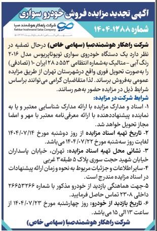 <table class="table table-bordered"> <tbody> <tr> <td><strong>موضوع</strong></td> <td dir="rtl"><strong>شرح</strong></td> </tr> <tr> <td> نام هلدینگ</td> <td>شرکت سرمایه گذاری آتیه صبا<br> </td> </tr> <tr> <td>نام شرکت درخواست دهنده<br> </td> <td> شرکت راهکار هوشمند صبا</td> </tr> <tr> <td> نوع فراخوان</td> <td>مزایده</td> </tr> <tr> <td> موضوع فراخوان</td> <td>آگهی مزایده فروش یک دستگاه خودروی سواری تویوتاپریوس شرکت راهکار هوشمند صبا</td> </tr> <tr> <td> روزنامه درج آگهی</td> <td> <span>روزنامه اطلاعات، صفحه 10</span><strong></strong></td> </tr> <tr> <td> تاریخ درج آگهی</td> <td>یکشنبه 13 <span>مهر 1404</span><strong> </strong></td> </tr> <tr> <td> لینک آگهی</td> <td><a href=" https://www.cspf.ir/Content/media/image/2025/10/%d8%a7%d8%b7%d9%84%d8%a7%d8%b9%d8%a7%d8%aa%201404.7.13_13293.pdf"> https://www.cspf.ir/Content/media/image/2025/10/%d8%a7%d8%b7%d9%84%d8%a7%d8%b9%d8%a7%d8%aa%201404.7.13_13293.pdf </a></td> </tr> <tr> <td> تصویر آگهی</td> <td><a href=" https://www.cspf.ir/Content/media/image/2025/10/%d8%b1%d8%a7%d9%87%da%a9%d8%a7%d8%b1%d9%87%d9%88%d8%b4%d9%85%d9%86%d8%af_13292.jpg?t=44895"> https://www.cspf.ir/Content/media/image/2025/10/%d8%b1%d8%a7%d9%87%da%a9%d8%a7%d8%b1%d9%87%d9%88%d8%b4%d9%85%d9%86%d8%af_13292.jpg?t=44895 </a></td> </tr> <tr> <td> لینک دریافت اسناد</td> <td> </td> </tr> <tr> <td>برنده مناقصه</td> <td><br> </td> </tr> <tr> </tr> </tbody> </table>