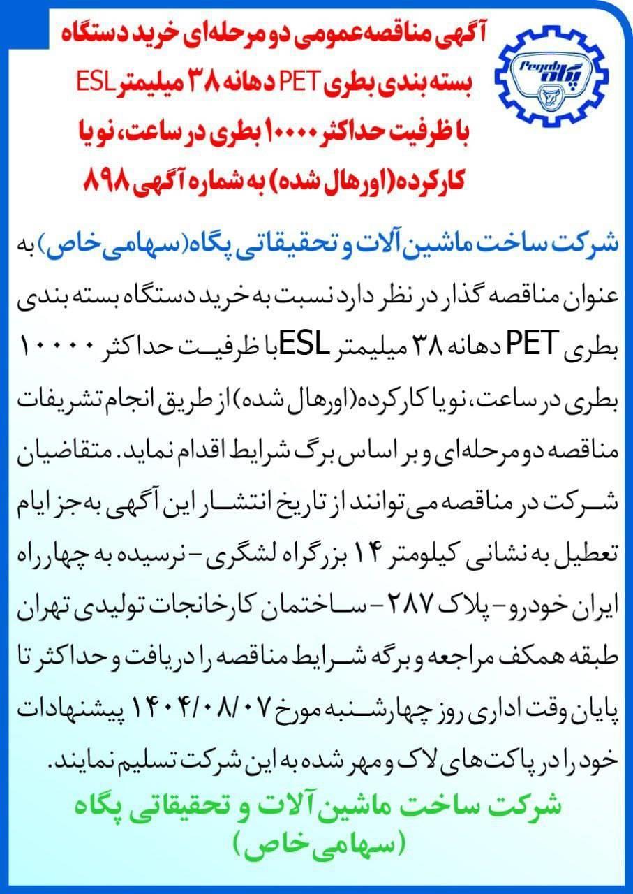 <table class="table table-bordered"> <tbody> <tr> <td><strong>موضوع</strong></td> <td dir="rtl"><strong>شرح</strong></td> </tr> <tr> <td> نام سازمان</td> <td> <strong>صنایع شیر ایران</strong></td> </tr> <tr> <td> واحد درخواست دهنده</td> <td> شرکت ساخت ماشین آلات و تحقیقاتی پگاه</td> </tr> <tr> <td> نوع فراخوان</td> <td>مناقصه عمومی</td> </tr> <tr> <td> موضوع فراخوان</td> <td>آگهی مناقصه عمومی خرید یک دستگاه بسته بندی بطری دهانه 38 esl ( نو یا کارکرده )شرکت ساخت ماشین آلات و تحقیقاتی پگاه</td> </tr> <tr> <td> روزنامه درج آگهی</td> <td> <strong>روزنامه دنیای اقتصاد، صفحه </strong></td> </tr> <tr> <td> تاریخ درج آگهی</td> <td> <strong>چهارشنبه 23 مهر 1404</strong></td> </tr> <tr> <td> لینک آگهی</td> <td><a href="https://www.cspf.ir/Content/media/image/2025/10/-2157472795387814142_48144267083715_13655.jpg" id="https://www.cspf.ir/Content/media/image/2025/10/-2157472795387814142_48144267083715_13655.jpg">https://cspf.ir/Content/media/image/2024/09/869_orig.pdf</a></td> </tr> <tr> <td> تصویر آگهی</td> <td><a href="https://www.cspf.ir/Content/media/image/2025/10/-2157472795387814142_48144267083715_13655.jpg" id="https://www.cspf.ir/Content/media/image/2025/10/-2157472795387814142_48144267083715_13655.jpg">https://cspf.ir/Content/media/image/2024/09/870_orig.jpg?t=638613929605134111</a></td> </tr> <tr> <td> لینک دریافت اسناد</td> <td> </td> </tr> <tr> <td>برنده مناقصه</td> <td><br> </td> </tr> <tr> <td>شماره قرارداد/کد قرارداد</td> <td> </td> </tr> <tr> <td>اسامی شرکت کنندگان</td> <td> </td> </tr> <tr> <td>لینک متناظر </td> <td> </td> </tr> </tbody> </table> <div align="right"> <table class="MsoNormalTable" dir="rtl" border="0" cellspacing="0" cellpadding="0" width="0"> <tbody> <tr> <td></td> </tr> </tbody> </table> </div>