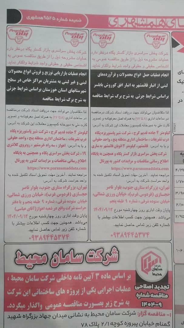 <table class="table table-bordered"> <tbody> <tr> <td><strong>موضوع</strong></td> <td dir="rtl"><strong>شرح</strong></td> </tr> <tr> <td> نام سازمان</td> <td> <strong>صنایع شیر ایران</strong></td> </tr> <tr> <td> واحد درخواست دهنده</td> <td> شرکت پخش سراسری بازارگستر پگاه</td> </tr> <tr> <td> نوع فراخوان</td> <td>مناقصه عمومی</td> </tr> <tr> <td> موضوع فراخوان</td> <td>آگهی مناقصه عمومی انتخاب پیمانکار حمل و توزیع و فروش محصولات لبنی در استان خوزستان و بابلسر شرکت پخش سراسری بازارگستر پگاه</td> </tr> <tr> <td> روزنامه درج آگهی</td> <td> <strong>روزنامه همشهری، صفحه </strong></td> </tr> <tr> <td> تاریخ درج آگهی</td> <td> <strong>شنبه 01 آذر 1404</strong></td> </tr> <tr> <td> لینک آگهی</td> <td><a href="https://www.cspf.ir/Content/media/image/2025/11/%d8%b1%d9%88%d8%b2%d9%86%d8%a7%d9%85%d9%87_14505.jpg" id="https://www.cspf.ir/Content/media/image/2025/11/%d8%b1%d9%88%d8%b2%d9%86%d8%a7%d9%85%d9%87_14505.jpg">https://tmp.cspf.ir/Content/media/image/2024/09/869_orig.pdf</a></td> </tr> <tr> <td> تصویر آگهی</td> <td><a href="https://www.cspf.ir/Content/media/image/2025/11/%d8%b1%d9%88%d8%b2%d9%86%d8%a7%d9%85%d9%87_14505.jpg" id="https://www.cspf.ir/Content/media/image/2025/11/%d8%b1%d9%88%d8%b2%d9%86%d8%a7%d9%85%d9%87_14505.jpg">https://tmp.cspf.ir/Content/media/image/2024/09/870_orig.jpg?t=638613929605134111</a></td> </tr> <tr> <td> لینک دریافت اسناد</td> <td> </td> </tr> <tr> <td>برنده مناقصه</td> <td><br> </td> </tr> <tr> <td>شماره قرارداد/کد قرارداد</td> <td> </td> </tr> <tr> <td>اسامی شرکت کنندگان</td> <td> </td> </tr> <tr> <td>لینک متناظر </td> <td> </td> </tr> </tbody> </table> <div align="right"> <table class="MsoNormalTable" dir="rtl" border="0" cellspacing="0" cellpadding="0" width="0"> <tbody> <tr> <td></td> </tr> </tbody> </table> </div>